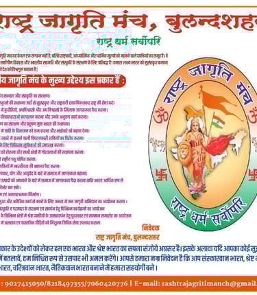 राष्ट्र जागृति मंच यह केवल एक संगठन नहीं है, बल्कि राष्ट्रवादी, आध्यात्मिक और धार्मिक मूल्यों को मानने वाले व्यक्तियों का समूह है। वे भारत के सर्वांगीण विकास और भारतीय सहमति और संस्कृति के संरक्षण के लिए प्रतिबद्ध हैं। हमारा लक्ष्य भारत को सुसंस्कृत बना और अपने देश को विश्वगुरु बनाना है ।